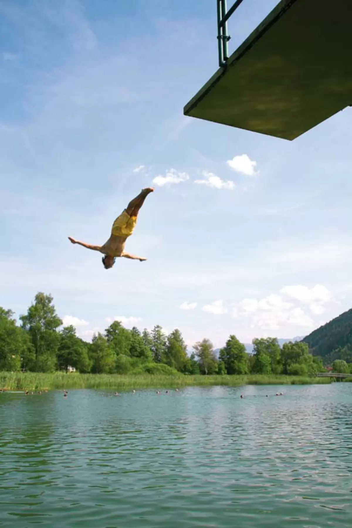 Doch das ist längst nicht alles, was das Freibad am Kleinen Alpsee zu bieten hat. Unsere Highlights sind das Floß mitten im See und der Sprungturm. Die Plattformen zum Abspringen befinden sich auf 1 m, 3 m und 5 m Höhe.